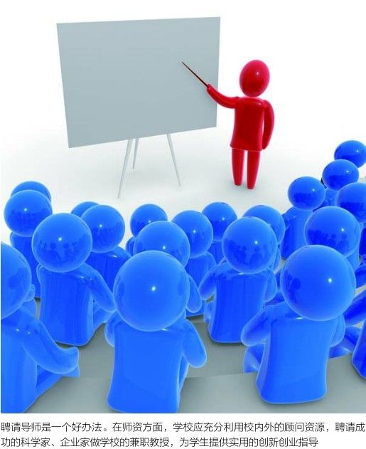 教学方式过于传统,学生的“个性”特点和“主动性”难于发挥,由于客观条件的限制,教师很难在有限的教学时间内做到因材施教,更无力顾及学生专业兴趣的培养,这些阻碍了创新教育的进程。聘请导师是一个好办法。在师资方面,学校应充分利用校内外的顾问资源,聘请成功的科学家、企业家做学校的兼职教授,为学生提供实用的创新创业指导。大多数的理工科院校会引入校外顾问,找到那些有经验并愿意分享的人,指导年轻的创业者。企业家与学校的接触,可以形成一个巨大的创业关系网络,对有志于创业的学生来说,还是一笔无形的财富。
