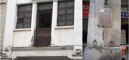 梧州骑楼具有两个有别于岭南其他地区的骑楼的特点。其一,楼房二层一般设有水门,是为了供居民在洪水泛滥浸街时,能够方便出入而设置的。具体来说,居民可以通过水门放下一把竹梯或软梯,通过它上下搭艇,也可以从水门处放下竹篮向沿街巡游的售货小艇购买米、油、蔬菜、火油、电池等生活必需品。(图2左)其二,临街砖柱上镶嵌铁环高低各一只,以备泊船时拉艇系缆之用。(图2右)