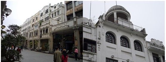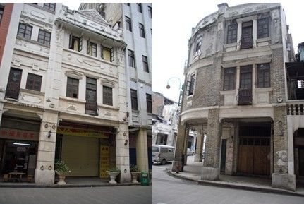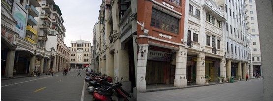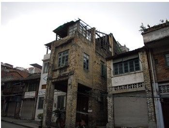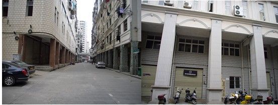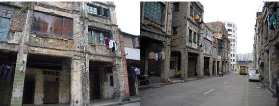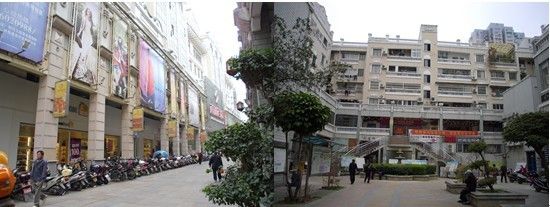 2、不少建筑的建设都是出于业主自身需求或者开发商的追求利润的动机,而缺乏整体的城市设计与规划,使得不少立面与空间处理失当。如图8左图中的建筑立面,就相当不自然,骑楼部分显得相当牵强附会;而右图则显示了立面色调处理的不一致。