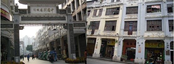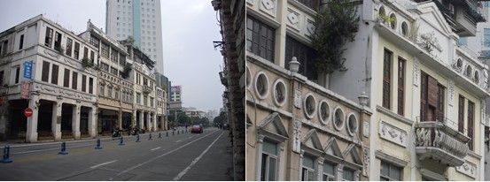 2、街道建筑立面处理相当丰富,高窗、窗楣、门头、檐部等,融合了岭南西关特色与近代西洋风格。