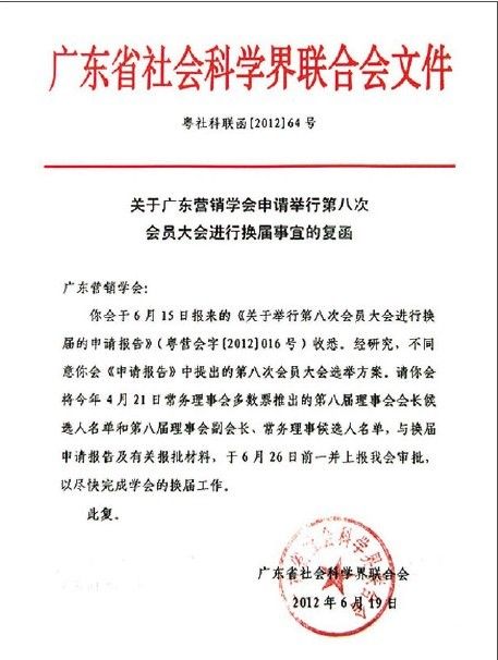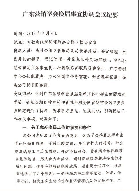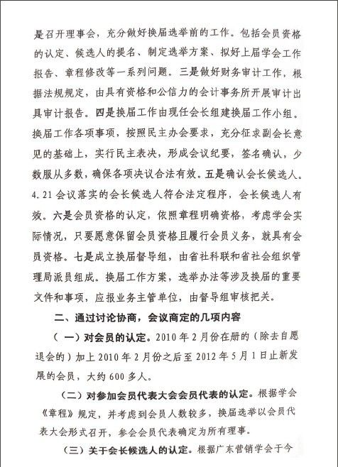 2012年6月19日广东省社会科学界联合会下发文件《关于广东营销学会申请举行第八次会员大会进行换届事宜的复函》(简称6.19文件)和2012年7月4日《广东营销学会换届事宜协调会议纪要》(简称7.4会议纪要)两份材料,对广东营销学会换届事宜作出针对性十分强的指导意见。由于文件发函单位和参加协调会的单位是业务主管单位广东省社会科学界联合会和登记管理机关广东省社会组织管理局,所以其意见的权威性毋庸置疑。材料有效地破解了换届工作的困难和矛盾,体现了两个单位领导高度的政治智慧、缜密的思维方式和过细的工作方法。