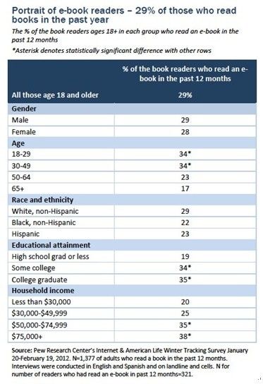 在2012年2月底的调查中发现,29%的成年图书阅读者在过去12个月阅读了一本电子书。总体上,这相当于整个成年人的21%。那些阅读电子书的人很可能在50岁以下,有大学及以上教育背景,生活在收入在5万美元以上的家庭中(如图2所示)。