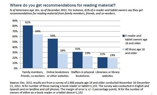 点评:多数人从自己认识的人(家庭成员、朋友及同事等)那里获得推荐,意味着电子书销售仍然非常倚重口碑传播,当然在线网站的推荐也不容忽视。
