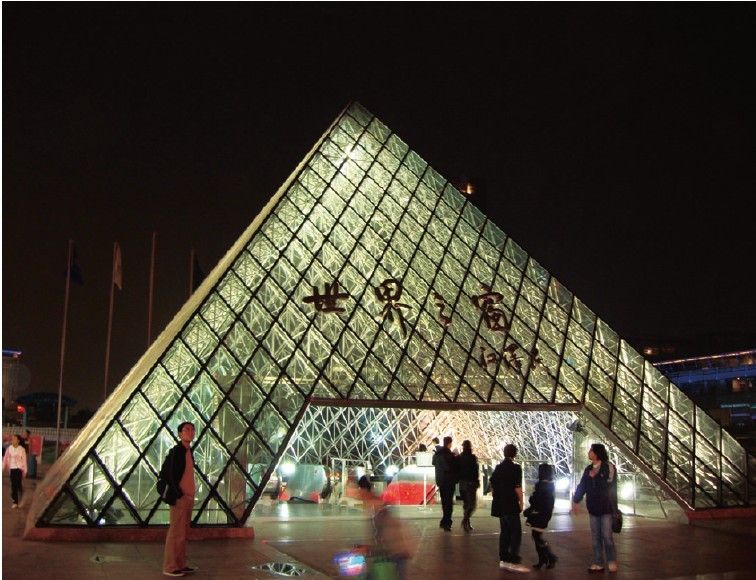 人类的各种感官中,视觉最为重要。人们从外界接受的信息中有87%是通过眼睛捕获的,并且75%~90%的人体活动是由视觉引起的。世界之窗广场地铁出入口的金字塔造型在视觉上是非常具有冲击力的,很能吸引人们的注意力。