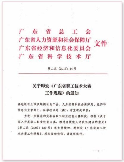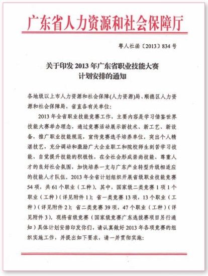 广东省政府有关职能部门,对2013年举办职工职业技能大赛非常重视。2013年1月17日,广东省总工会、广东省人力资源和社会保障厅、广东省经济和信息化委员会、广东省科学技术厅等单位,联合下发“粤工总[2013]14号”文;2013年2月28日,广东省职工职业技能大赛组委会下发了“粤技组函[2013]1号”文,即《关于印发<广东省职工技能大赛工作规程>的通知》;2013年3月19日,广东省人力资源和社会保障厅专门下发了“粤人社函[2013]834号”文,即《关于印发2013年广东省职业技能竞赛计划安排的通知》(详见有关文件)。