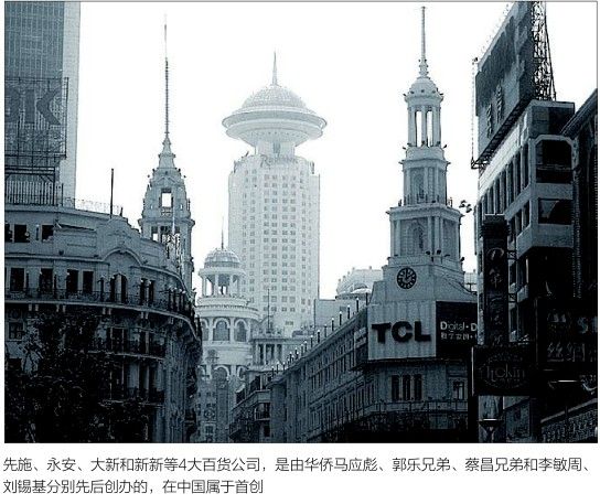 同期,先施、永安、大新和新新等4大百货公司,是由华侨马应彪、郭乐兄弟、蔡昌兄弟和李敏周、刘锡基分别先后创办的,在中国属于首创。他们从海外到香港、广州、上海等地,逐步创建了一套崭新的百货销售新理念、新制度、新模式,引发了中国社会的新式消费潮流。