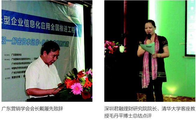 论坛特邀广东营销学会智库开发中心专家库成员:中国互联网信息中心(CNNIC)授权讲师余芳、资本运作权威机构专家刘文华老师分别讲授“如何走出信息化建设误区”和“企业资本运作新模式”两个主题内容。在信息化主导的时代,我们如何走出信息化建设误区,运用信息化工具,实现企业盈利最大化?本次论坛为参会企业在信息化发展过程中提供了参考与指导。深圳君融理财研究院院长毛丹平博士作总结点评,她特别指出,现阶段中国民企界发展存在急进之风,并呼吁企业家在发展的道路上应稳步趋之。