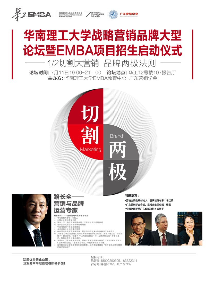 您好!市场环境瞬息万变,市场营销的变革与创新一直成为企业关注的焦点。由广东营销学会与华南理工大学联合主办的“战略营销”品牌大型论坛暨EMBA项目招生启动仪式 ,7月11日(星期五)晚19:00-21:00时于华南理工大学12号楼隆重召开,捕捉年度营销热点话题,引领战略营销新风向,共享战略营销智慧。