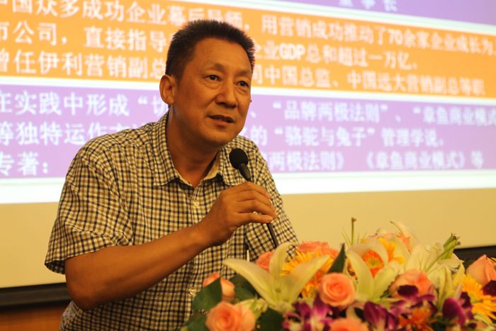 接过麦克风,路长全就借喻打太极拳的章法与力道,诠释他所理解的营销到底是个什么东西?他那略带口音的普通话,不急不缓的语言节奏,在切入正题后,侃侃而谈从容自若,颇具个性的谈吐引来观众席上阵阵掌声与笑声,近70分钟的精彩开讲,老师的风趣幽默令人忍俊不禁,会场气氛轻松而愉悦。路长全首先就亲自操刀的个案徐徐道来,从3万元快餐小店、棉袜产品到30万的挂面生意,再到300万玉米油……精彩纷呈,业绩不俗。
