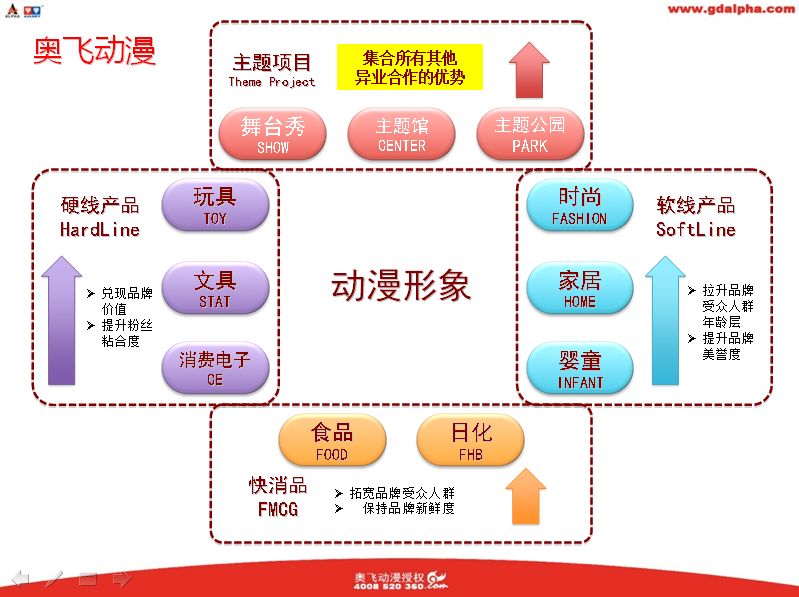 有一条成功法则这样说:如果你想要转型,但自身能力缺乏,最好的办法就是傍个大款,专业点的说法就是资源整合,在这方面,奥飞动漫干得不错。早期,奥飞动漫从单纯的出口玩具生产商转型国内市场,引进日本田宫的成熟的“四驱车”系列产品。并结合此类玩具,引入日本动画片《四驱兄弟》和《四驱小子》,尝试代理日本动漫形象进行产业化经营。然后再电视台播出的同时,推出玩具,从而使四驱车玩具迅速成为国内玩具销售的主流。之后便成功进入动漫影片的制作、发行和推广,全面铺开动漫产业的布局。