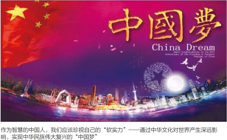 今天国际上除了关注一个国家的综合国力外,还越来越关注这个国家的“软实力”。与以经济和军事力量为代表的“硬实力”不同的是,“软实力”是一个国家通过其文化和价值观来施加影响力。作为智慧的中国人,我们应该珍视自己的“软实力”——通过中华文化对世界产生深远影响,实现中华民族伟大复兴的“中国梦”。