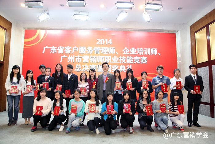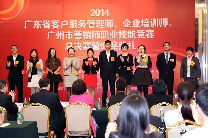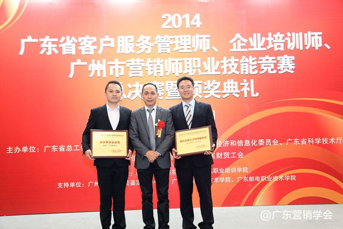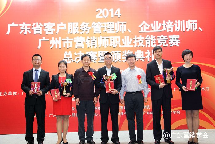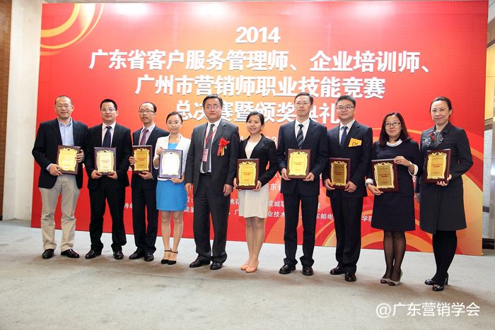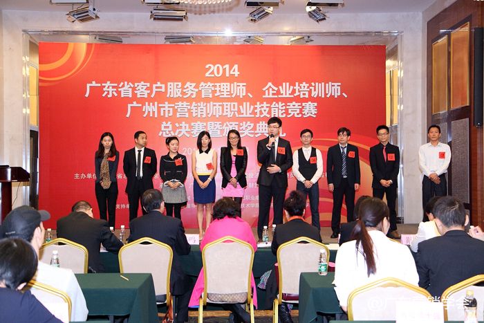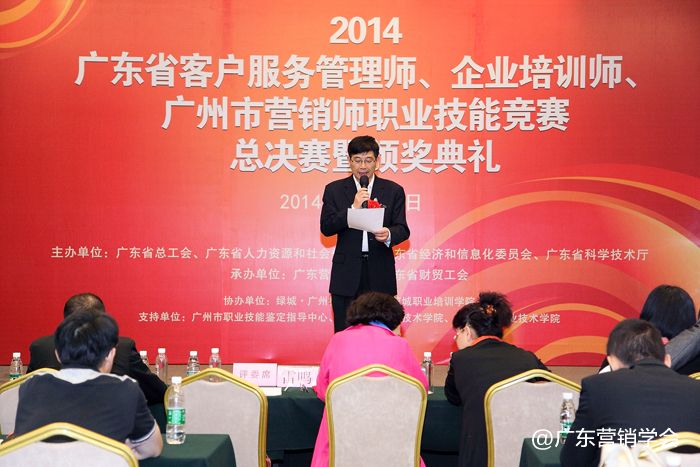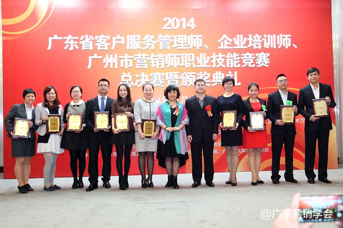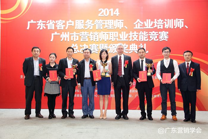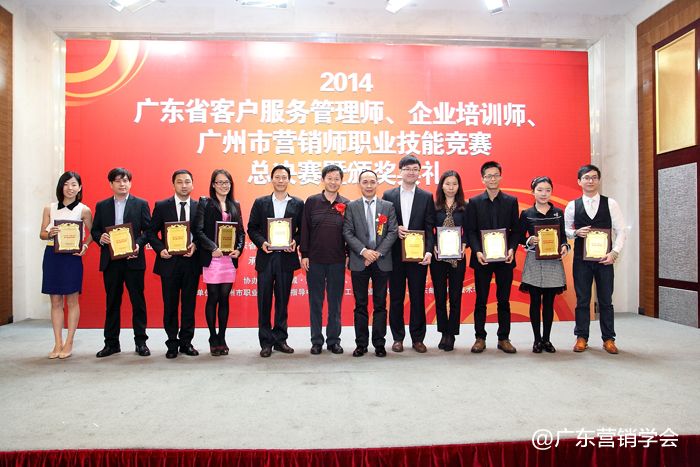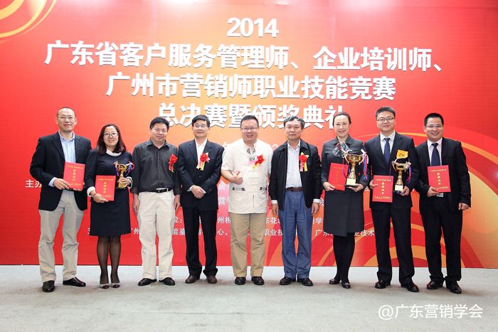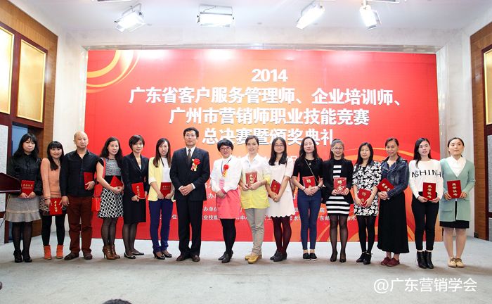 2014年11月23日,由广东省总工会、广东省人力资源和社会保障厅、广东省经济和信息化委员会、广东省科学技术厅联合主办,由广东营销学会、广东省财贸工会承办的2014广东省客户服务管理师、企业培训师、广州市营销师职业技能竞赛总决赛暨颁奖典礼在广州浙江大厦5楼浙江厅顺利举行。