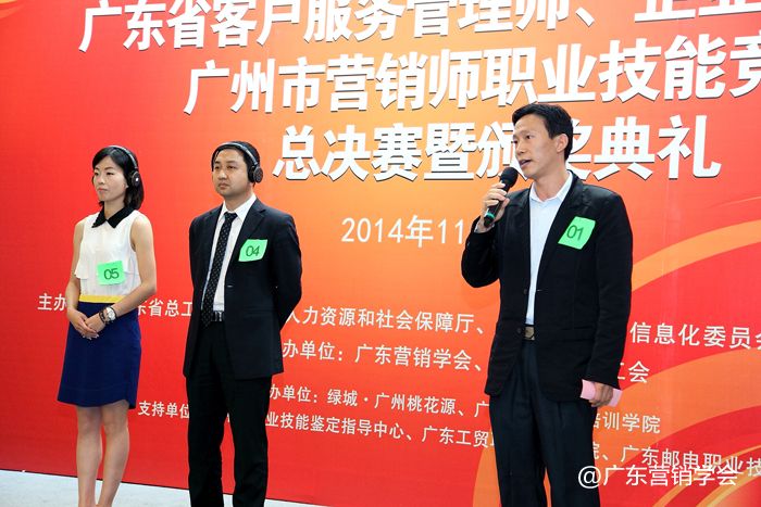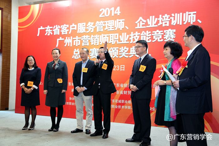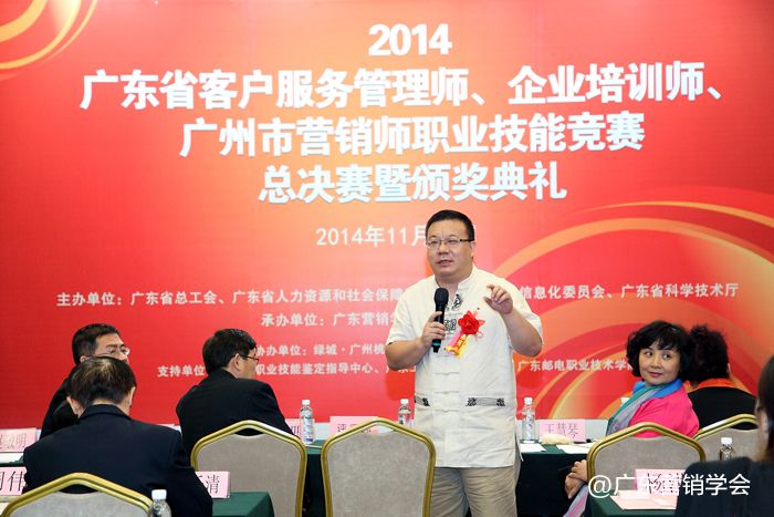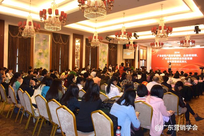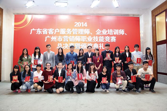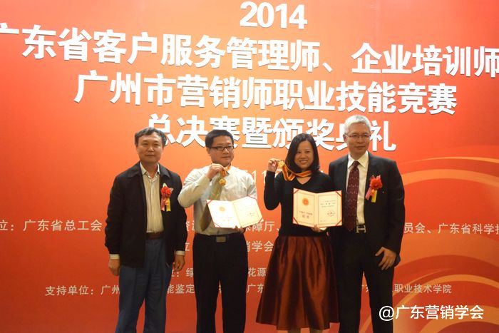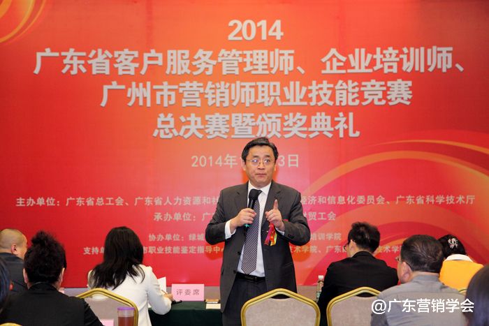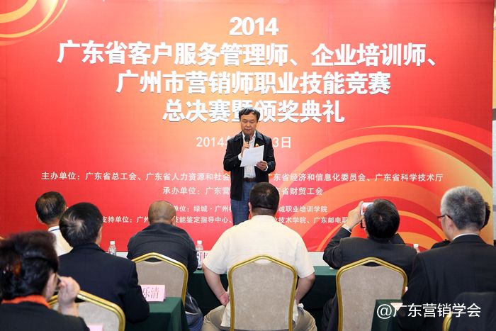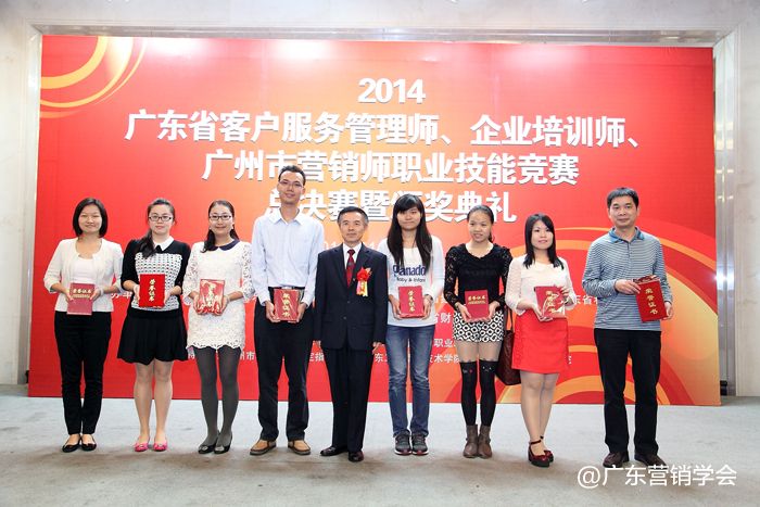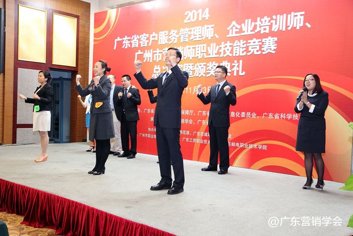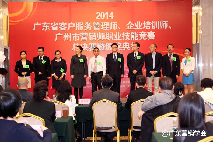 2014年11月23日,由广东省总工会、广东省人力资源和社会保障厅、广东省经济和信息化委员会、广东省科学技术厅联合主办,由广东营销学会、广东省财贸工会承办的2014广东省客户服务管理师、企业培训师、广州市营销师职业技能竞赛总决赛暨颁奖典礼在广州浙江大厦5楼浙江厅顺利举行。