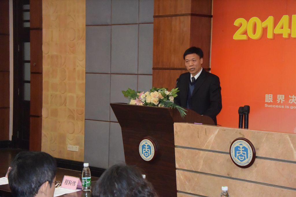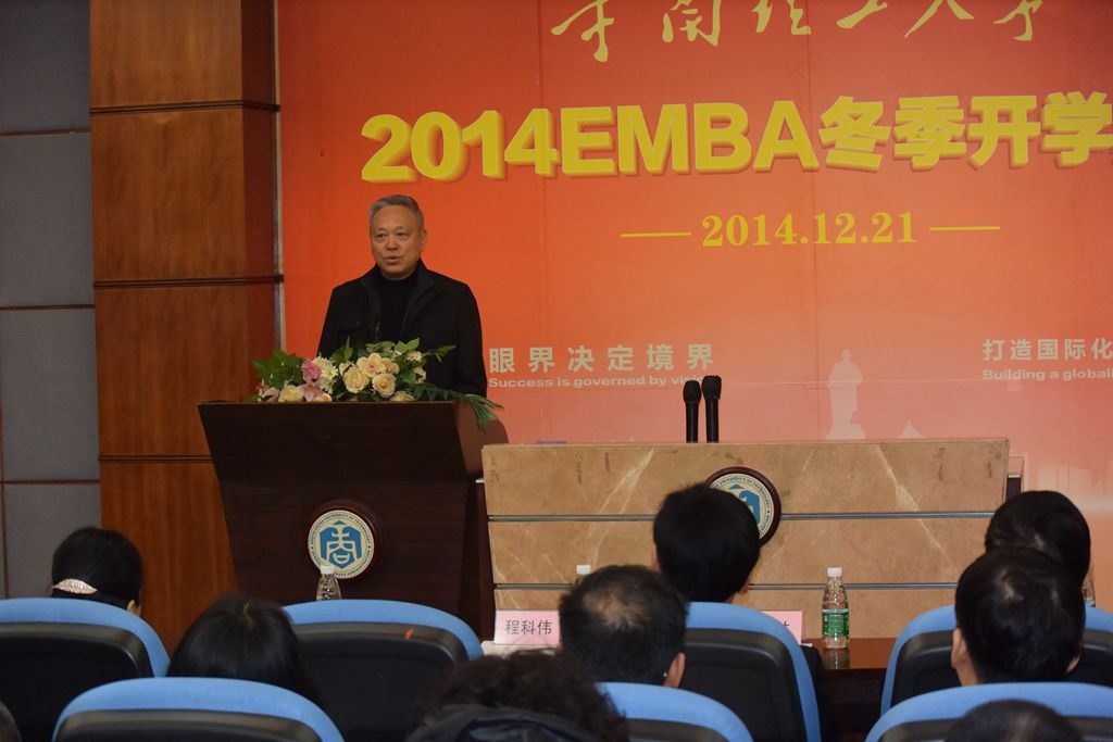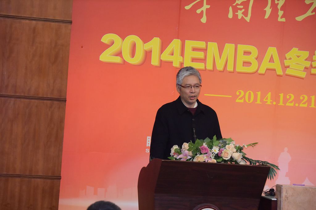 2014年12月21日11时,华南理工大学12号楼107室,2014EMBA冬季开学典礼在庄严神圣的国歌声中徐徐拉开,先由主持人恭请华南理工大学工商管理学院赵永林书记与深圳市政协副主席程科伟上台向各位学员致辞。