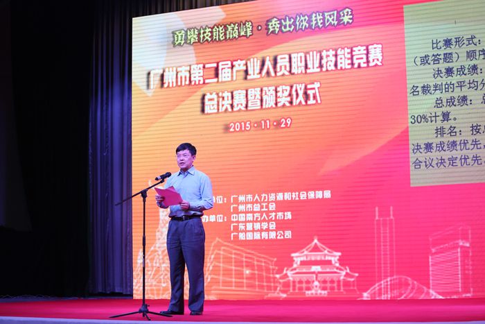 11月29日,广州市第二届产业人员职业技能竞赛(现代服务业)总决赛暨颁奖仪式,在第一次全国劳动大会旧址隆重举行。市人力资源和社会保障局巡视员冯星树,市总工会副主席李德球、副巡视员张润钧等领导,市人社局、市总工会、市技鉴中心、中国南方人才市场、广东营销学会、广船国际有限公司等有关部门和单位负责人,专家、裁判、选手、企业代表等200人出席。