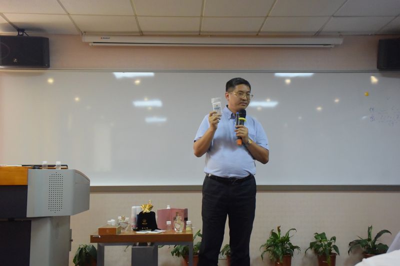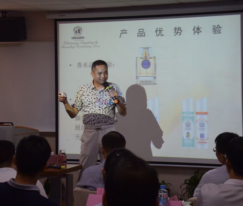 广东汀大生物科技有限公司总裁何志明先生,同时也是广东营销学会的副会长,现场给与会者演示了由其公司自主研发的香水系列和除臭系列产品。