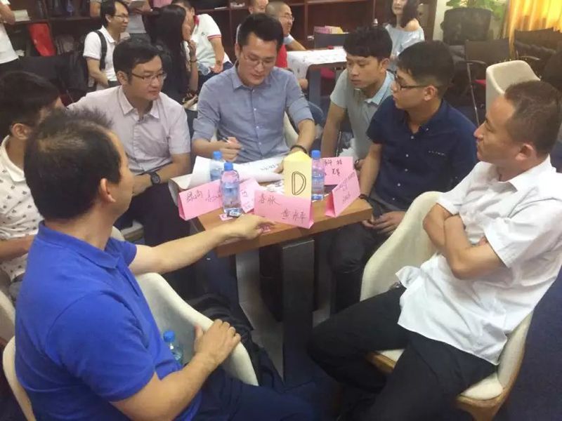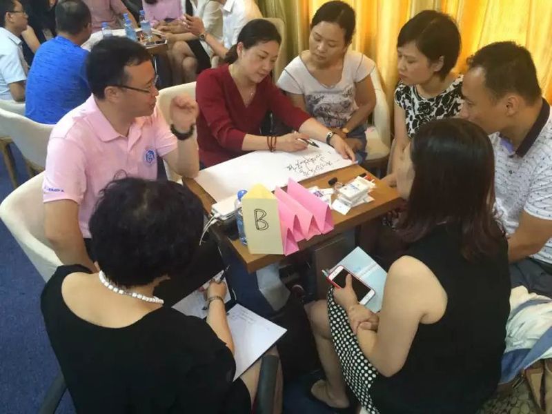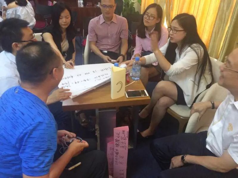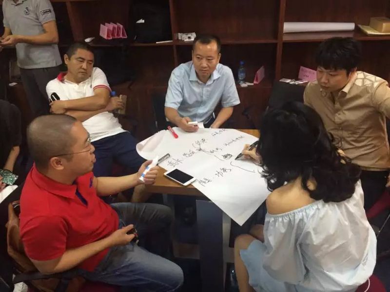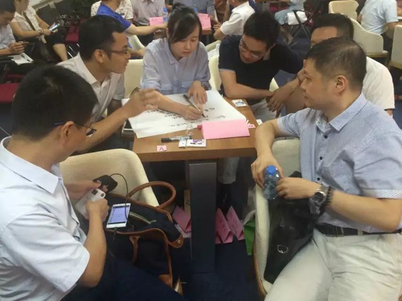 现场精英们已经在沙龙的破冰环节两两相互认识和分组,研讨环节是把大家分为6组,再针对以上问题一一展开头脑风暴,组员之间观点激烈碰撞,大家最后研讨的结果分别写在活页纸上,由每组代表上台展示并陈述自己组的观点。