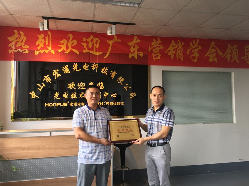 2016年8月19日上午,广东营销学会副会长兼秘书长张珀维、学会副秘书长蔡淦绵、会员部专员李苑琳一行3人前往中山市宏浦光电科技有限公司授予会员单位牌匾及交流考察。宏浦光电公司总经理薛淮天、营销部李静华等热情的接待了广东营销学会秘书处一行。上午11时,总经理薛淮天先生从广东营销学会副会长兼秘书长张珀维先生的手中接过了广东营销学会会员单位的牌匾。颁牌结束后,在薛总的陪同下,秘书处一行参观了该公司产品车间生产情况,培训中心课室环境以及师资情况,随后我会副会长张珀维及副秘书长蔡淦绵就如何发展智能灯饰技术的市场营销问题以及相关的合作事宜展开了亲切交流和探讨,双方互相交换了意见并初步达成合作意向。