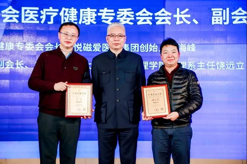 广东营销学会医疗健康专委会授牌:专委会会长德悦磁爱医生集团创始人孙海峰;专委会副会长、广州中医药大学经济与管理学院管理系主任饶远立