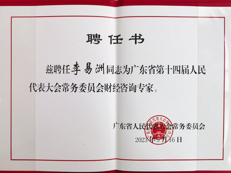 据悉,省人大常委会高度重视财经咨询专家的选聘工作,按照政治合格、结构合理、广泛涵盖、择优聘任的选聘原则,经公开选聘、资格审核、履职能力评估、反复酝酿研究提出建议名单,已于今年5月在省人大常委会会议审议通过并公布名单。与李易洲一起获聘的还有:全国人大财经委原副主委尹中卿、省税务局一级巡视员朱江涛、省人社厅一级巡视员阙广长、上市公司白云电器董事长胡德兆、泛华金融董事长翟彬、广东省社科院副院长向晓梅、广州市社科院副院长尹涛、北大深圳研究生院副院长兼汇丰商学院院长王鹏飞、香港科技大学(广州)社会枢纽院长谢丹阳,还有中大、华工、暨大、华师、华农、广外、广工、广财、广金、澳门城大、南方科大、省委党校、东莞党校等高校教授或研究员,以及多位政府公务员、社团领导、注册会计师、律师、企业高管等,李易洲是唯一的管理咨询师、营销师。