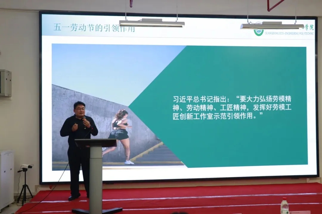 随后,专题讲座环节邀请了“广东省五一劳动奖章”获得者龙飞进行主题分享。龙飞以自己的成长经历为线索,详细介绍了自己的学习背景、工作经历、荣誉成就以及个人优势,并通过问答互动和案例分析的方式,向大家传授了求职的宝贵经验和职场心得。他特别强调了劳模工匠精神的深刻内涵,认为工匠精神不仅代表着对技艺的精湛追求,更体现了对工作的敬业精神和对品质的不懈坚守。他鼓励在座的同学们要崇尚劳动、尊重劳动、热爱劳动,持续发扬中华民族的优秀传统美德。